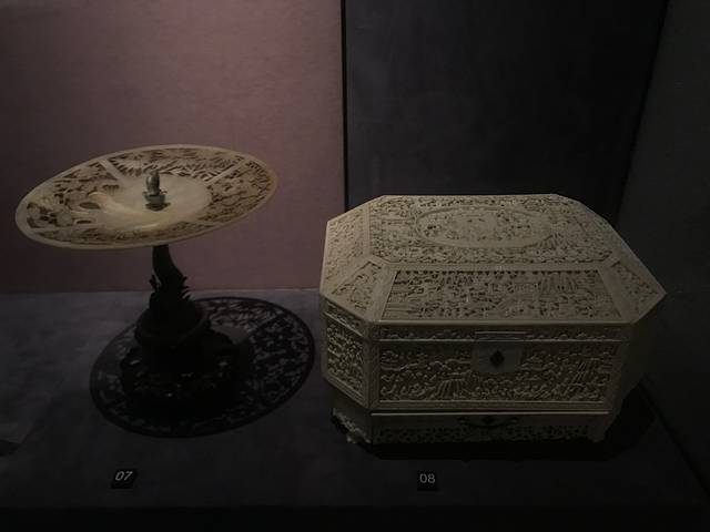 右:象牙雕针线盒,仔细看,上盖雕刻的是人物贺寿图像,其他部分就是一些市井风土人情和花卉