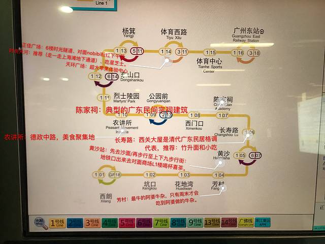 广州地铁非常便捷,我最喜欢的应该就是这条线路了,把去过的地方以及吃过的地方,在这条线路上做了个概要备注,希望对之后想去广州的朋友有帮助