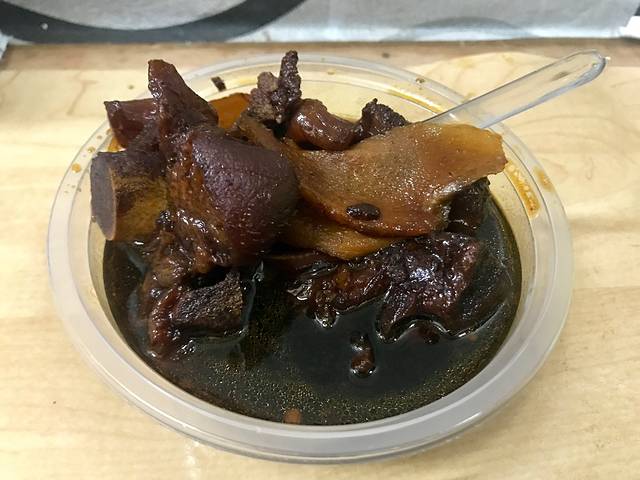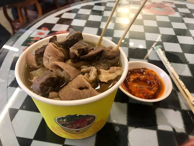 全广最好吃的应该是芳村的“阿婆牛杂”,不想走那么远了,今天试了一下“老广牛杂”,前几天朋友再三推荐一定要去吃萝卜牛杂,今天试了。点了一份最小份,看旁边🈶️各种辣酱惯性的拿了小碟装了甜辣酱。汤汁香醇,萝卜清甜,牛杂酥烂,先吃原汤中的料,后吃加了辣酱的料,各有各的美。