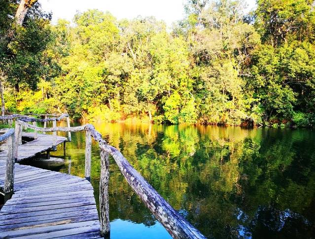 所谓“一日不同季,十里不同天”,过了桥,一个更让人迷恋的世界瞬间温柔了我的心。碧绿的天然水池如同镜子一般,映照着岸上的一草一木。没有大批游客的拥挤,没有嘈杂的喧闹,好像一切都静止了。
