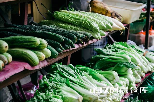 对面就是社区里的菜市,成都很多社区里都有这样店铺,老板每天早晨去市场拉回今天要卖的菜,以供周围社区居民买菜方便。