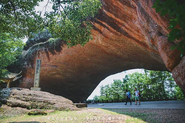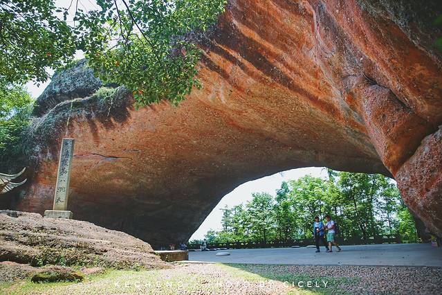 山顶有一处石梁,东边石壁上刻有“天生石梁”四字,巨大的天然拱顶下有一个巨大的围棋盘。炎炎夏日,外面日光强烈,石梁下却是凉风习习,是个纳凉的好地方。