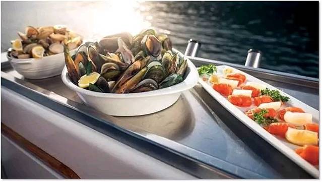 在游船甲板上享用美酒海鲜