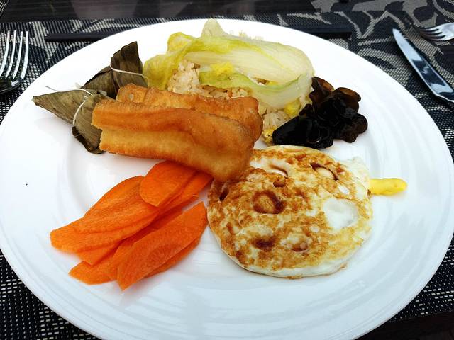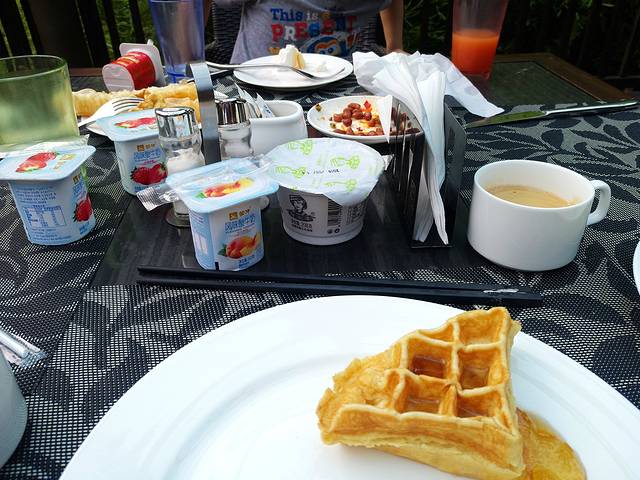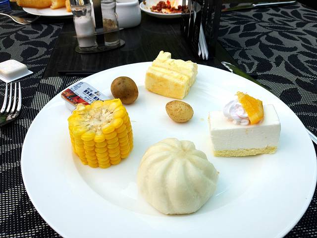 早餐丰盛,该有的都有。。而且室外的空气好,也不吵,人不多。。