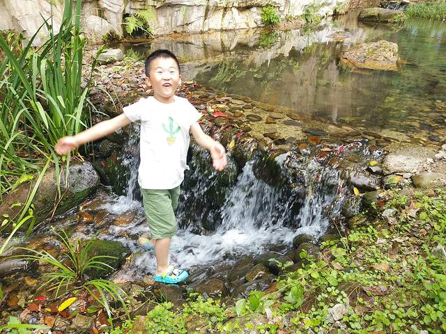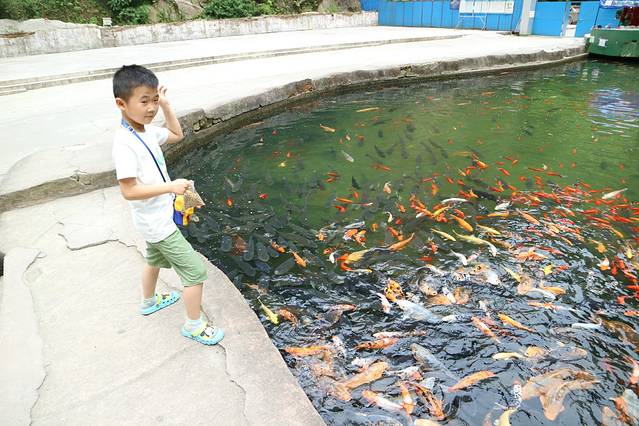 瀑布下面有一个人工湖,养了很多锦鲤,可以提供喂食,5元一包。。