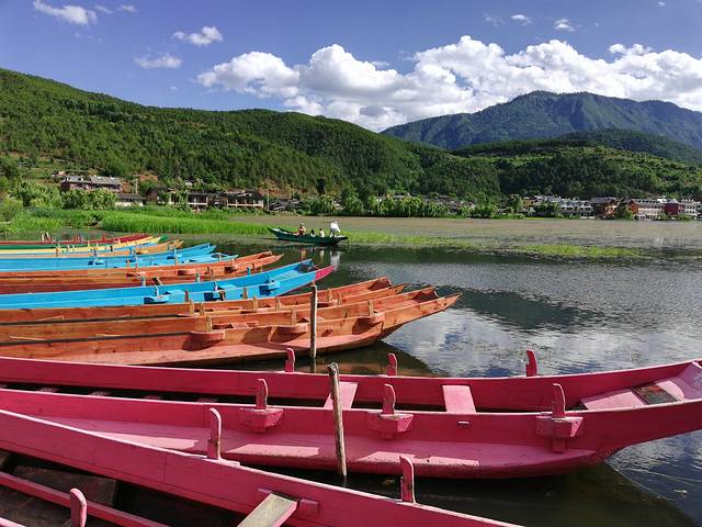 酒店就在环湖公路边,沿着公路散步很不错,车子不多,道路洁净,偶尔遇到几个当地村民也会友善微笑。从公路往四川方向散步,走了15分钟左右到达普洛码头。普洛码头的船只比较多,但是又不至于像吕家湾码头那样一堆旅游大巴,这样的地点对我来说刚刚好,不会过于冷清,也不会太吵闹。色彩鲜艳的船只停驻码头,可以上去拍照,水边栈道也是超有feeling。