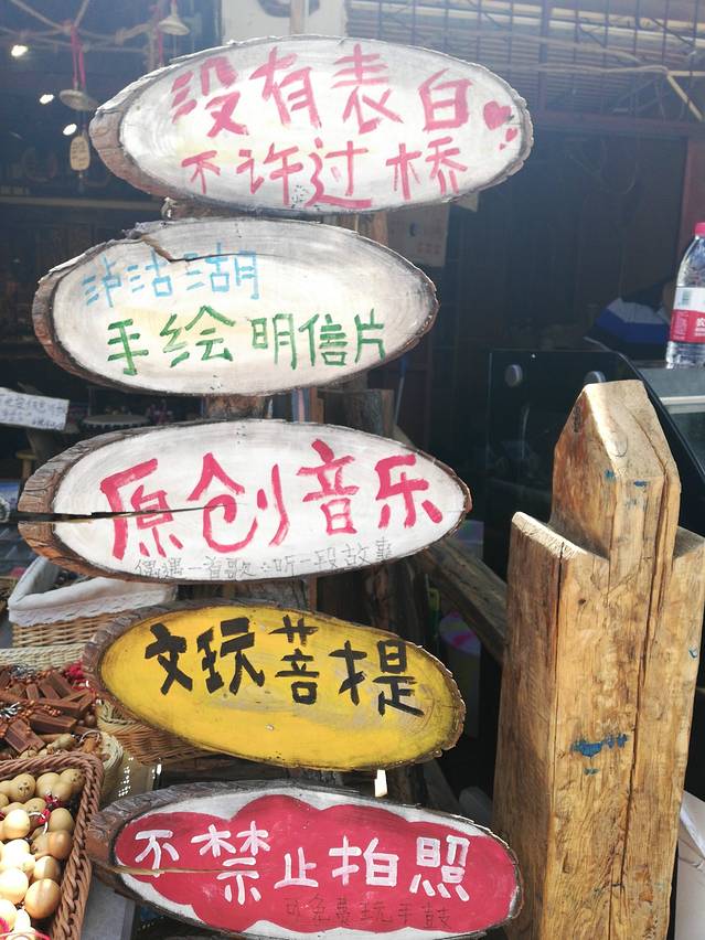 走婚桥并不长,300米,桥上很多小摊贩,买点小吃尝尝也是不错。景区物价,无可厚非。桥头有一家卖小玩意儿的店,商品一看就是义务来的,不过招牌比较好玩。