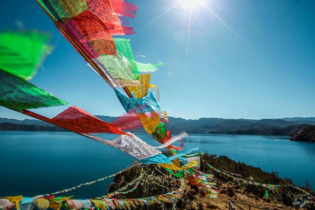 四川情人滩过去几分钟就到达了挂满经幡的泸源涯,请把每个字分解开来,也就知道这个地点的意义了,泸沽湖+水源地+山崖。