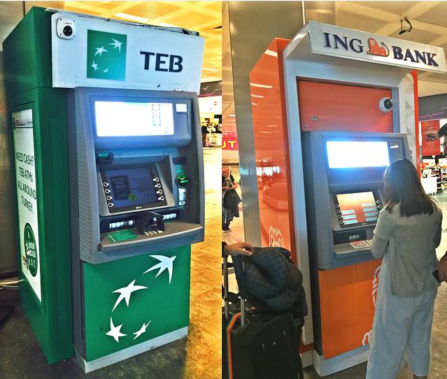 用的是菲律宾Citibank,起初我都站在旁边指导的,有英文选项,也是一步步按照英文的指示,按到最后确认后,等了好几分钟,钱没出来,卡也没出来,我的妈呀!问她有没有登记,她说有去跟银行秘书说,她的卡是免手续费的,but等了好久什么都没有,最后跑出一堆土文,鬼看得懂,找了机场人员帮忙,没有一个帮得上叫我们打给客服,打了也没用,后来还是这可怜得Ate打长途给秘书,暂时冻结了这张卡才结束了这惊悚的取钱经验。听说ING Bank 有个狮子标签的这家银行很爱吃卡,所以大家千万避开了呀。所以菲律宾的小伙伴们,你们还是不要冒险了,乖乖的买些美元还是欧元再去土耳其,不要随便用ATM取钱。