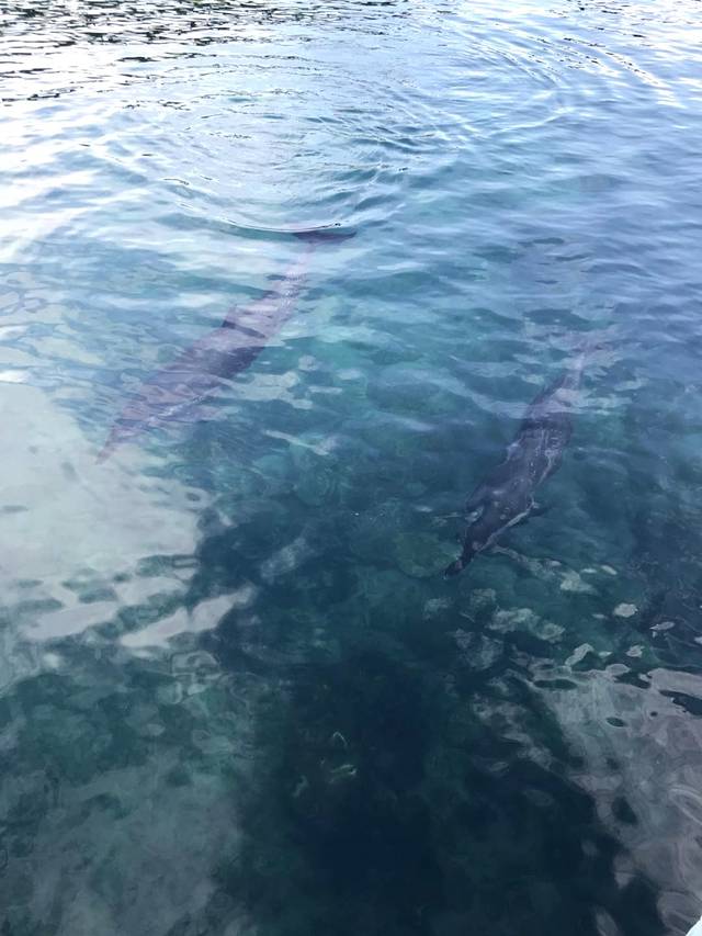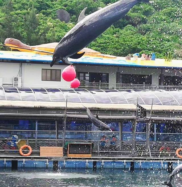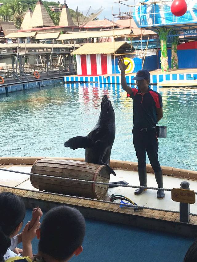 海豚表演门票住店客人优惠价60元/人,场地是露天的,据说是直接圈起来一小块原生海域搭建而成。现场除了我们一行人,还有几位小观众。