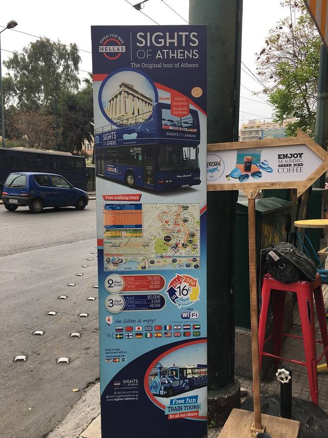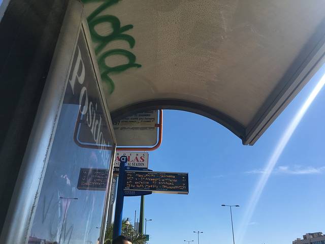 售票处旁的大巴站牌,左边是 希腊 文,右边是英文,我们坐的是X93,到L打头的那一站