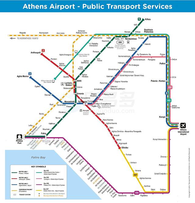 X96:单程90分钟,机场— 比雷埃夫斯 港口 Piraeus站 (可换绿线Line 1地铁)
