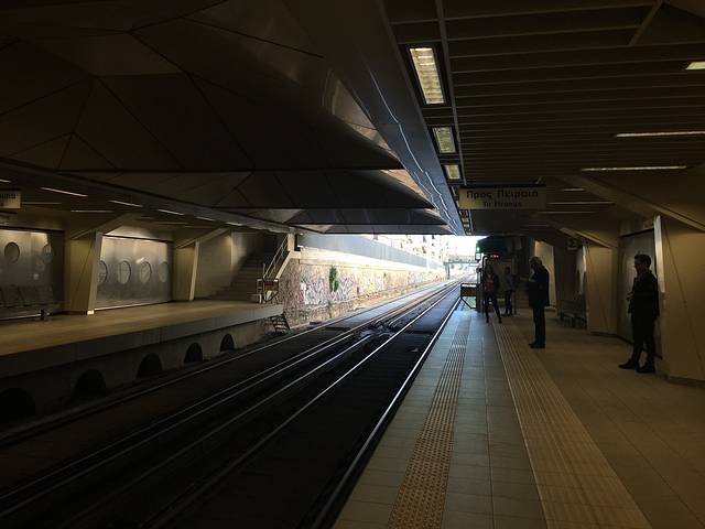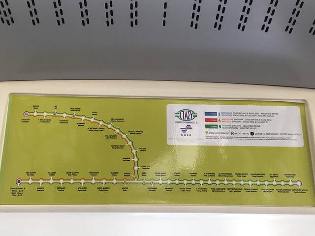 回程时,从 雅典 市内乘地铁到机场,不是所有地铁都到机场站,据说只有车窗上有飞机标志的列车到机场。大约半小时一趟,站台上的进站提示屏幕也会提示去机场的车还有多久来
