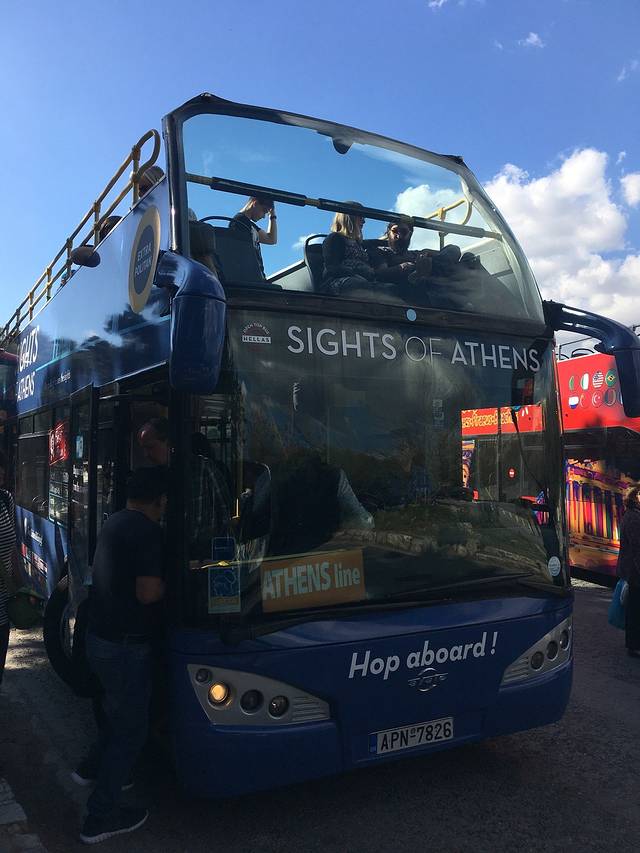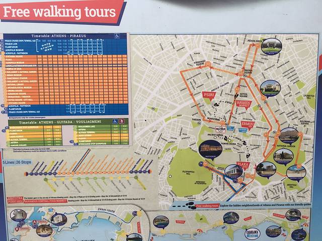 大巴的线路有三条,红线是市内,全程环线大概90分钟,蓝线是卫城到比雷艾夫斯港方向,单程30分钟,中间会停共15分钟左右,绿线是卫城到沃拉方向的海滨路线,单程60分钟左右,中间会停共30分钟左右