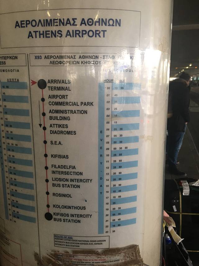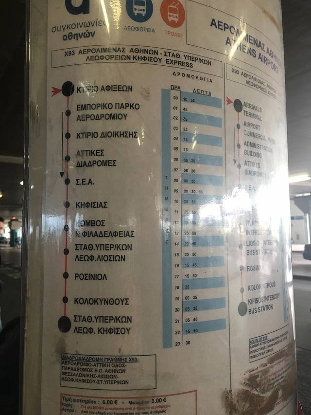 X93:单程65分钟,机场—基菲索 KIFISOS(巴士总站A),途中可到里奥西翁 LIOSION (巴士总站B), 还可到郊区火车站 KIFISIAS
