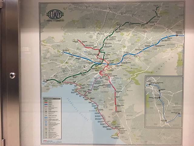 有轨电车的三条线路,红色,绿色、蓝色,站点名称如下图,左上角的是首发站宪法广场,下方横线左边是比雷艾夫斯港口方向,右边是格利法达和沃拉方向