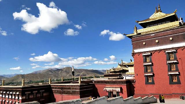 色拉寺依山面河,绿树掩映,高耸的金顶在蓝天的映托下熠熠生辉。