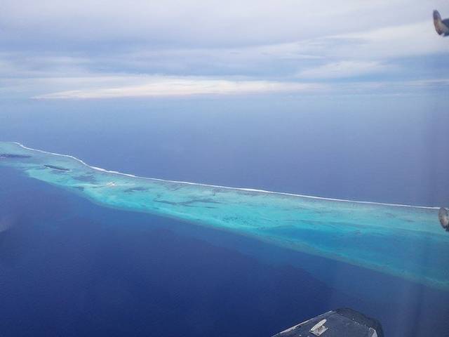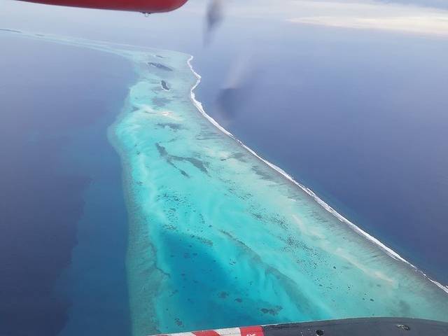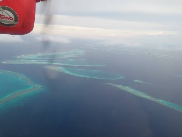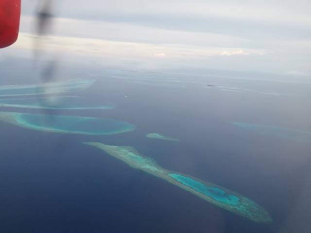 之前就看攻略说水飞机要坐左边景色好,果真如此,至少我们到这个岛是这样的,上岛的时候右边是日出的方向,所以海面都反光看起来是银白色的。左边就是一片湛蓝,非常的难。回程的时候上下午,所以还是左边就景色正好。