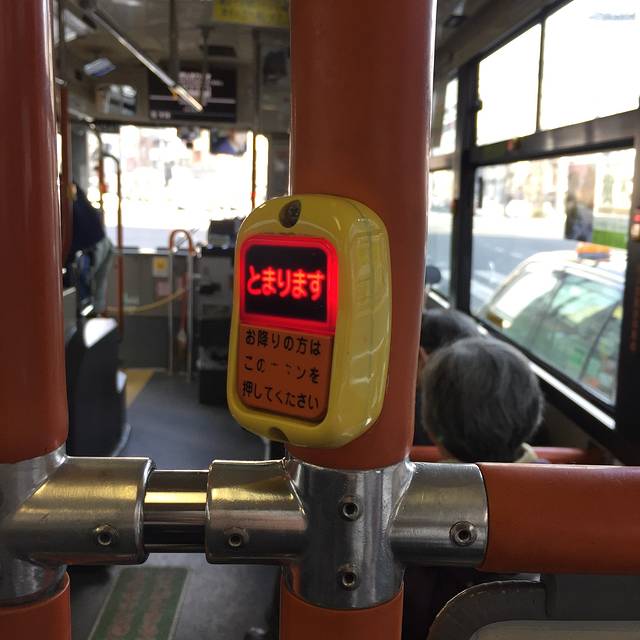 就是右边这种黄黄的,在下车之前按下。指示灯变成红色,代表已经有人按了,就不用重复了。一定要记得按,不然公交车是不会停的。