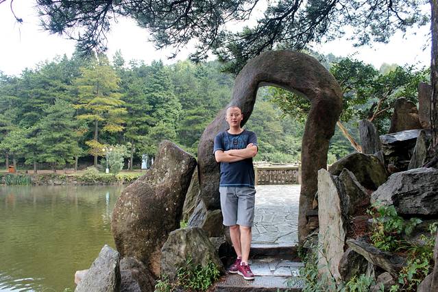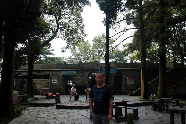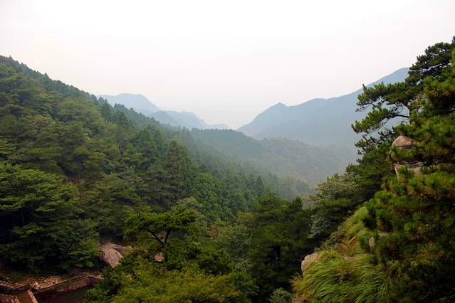 早上7:00吃过早餐,我们从运管所站乘车到含鄱口站下。漫步在岭脊上,北可望五老峰,东可瞰鄱阳湖。含鄱岭南端建有一石坊,四柱三门,坊中央镌有"含鄱口"字样,其左右分别刻有"湖光"、"山色"四字。