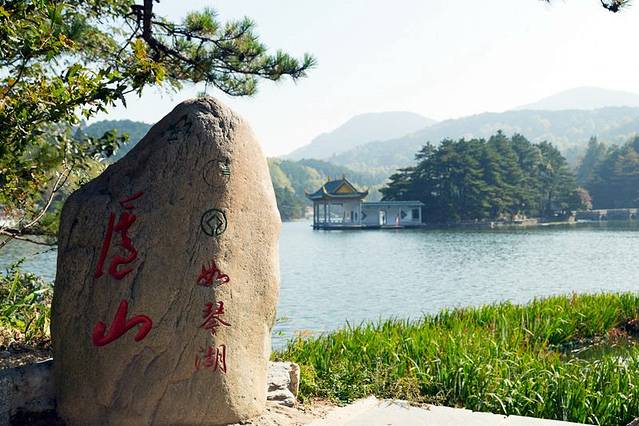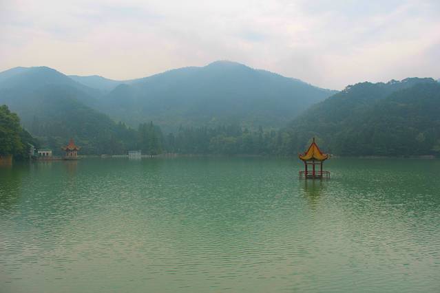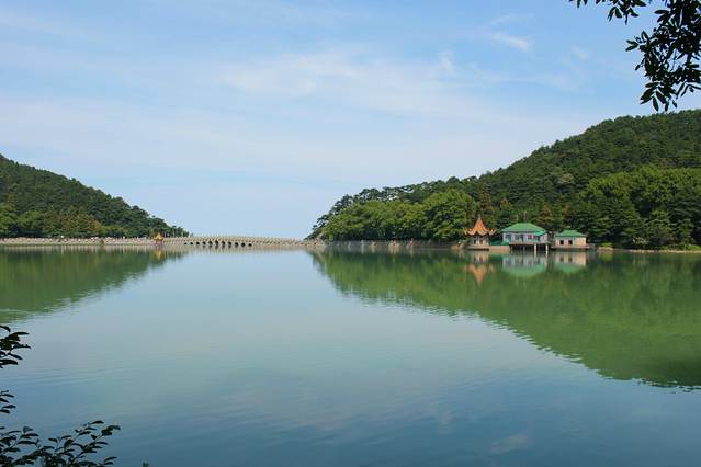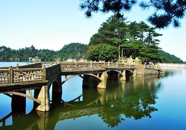 乘坐观光车到达花径站下车,首先映入眼帘的就是一片静谧的湖泊——如琴湖。因其湖面形如乐器小提琴,所以得名如琴湖。