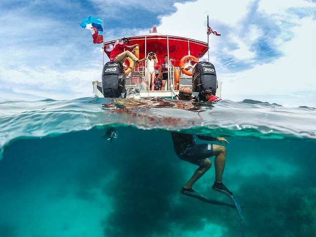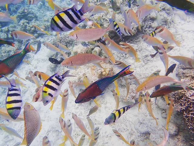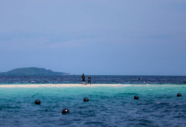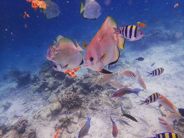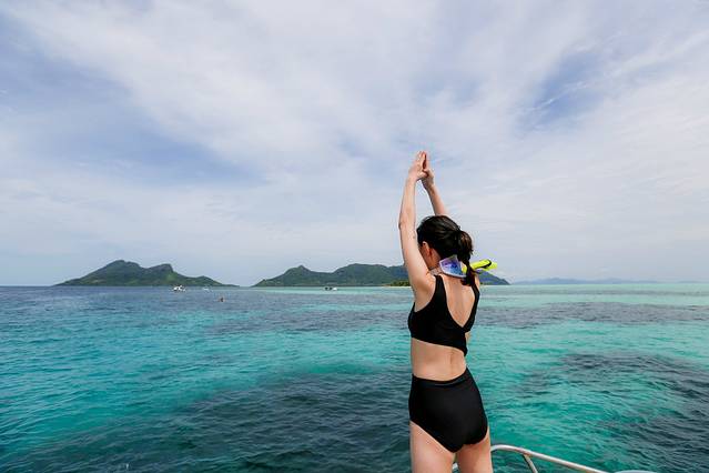 在一天的跳岛行程中有三次浮潜的机会,我印象最深的就是曼达布湾了。海水的能见度很高,珊瑚和热带鱼都很多,不会游泳也没关系,船员会提供救身衣和浮潜面镜,只要趴在水面就可以看到奇妙的海底世界。