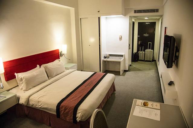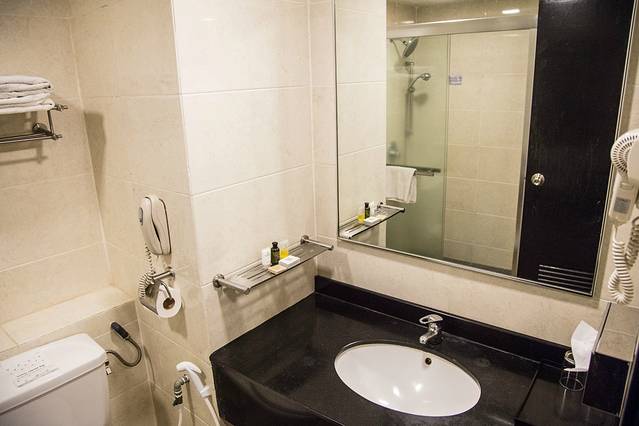 有电梯直达客房楼层。房间不大,有一面落地窗,所以采光和通风都很好,房间里设有免费wifi和中央空调,隔音效果好。即使就在机场旁也不会听到飞机起落的噪音。床上用品干净舒适,插头和国内不一样,需要转接头。卫生间不大,有24小时热水,没有提供沐浴露和洗发水,牙膏牙刷这些都没有提供。