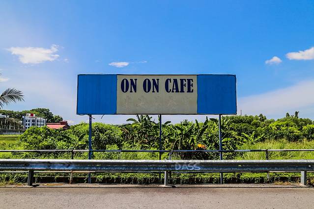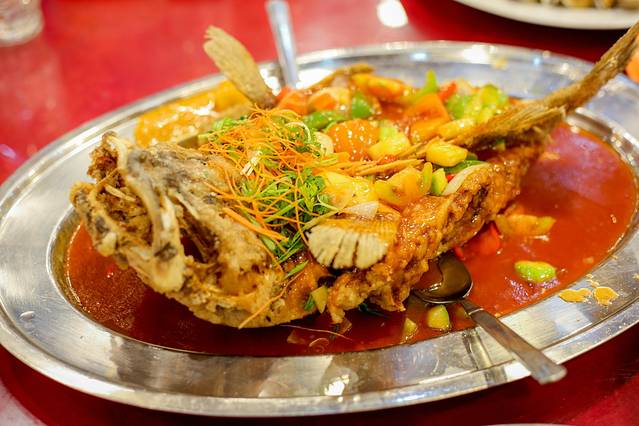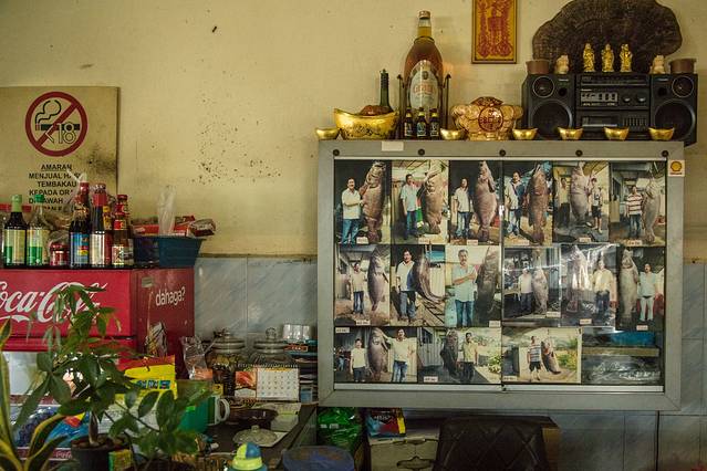 在当地人的推荐下,午饭我们去了安安茶室(on on cafe)。这家最有特色的就是鱼了,墙上挂满了老板钓鱼的照片,每一条鲈鱼几乎都跟成年男子差不多高,最重的甚至有80多公斤。