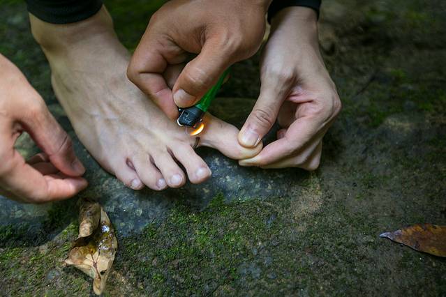 从瀑布区出来,感觉脚有刺刺的疼,才发现被水蛭吸了。小伙伴赶紧拿来打火机把它烧掉,如果用手拉它,那被它咬的地方就会有很大一个伤口。同行的另外一位也被水蛭咬了,但是那只水蛭已经吸饱血松口了,整条水蛭都变得鼓鼓的,我们赶紧把伤口进行了消毒。