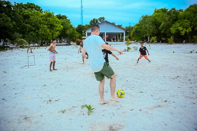 傍晚的时候在沙滩遇到一群踢足球的年轻人,于是中马大战就此拉开,最后双方打成了平手。
