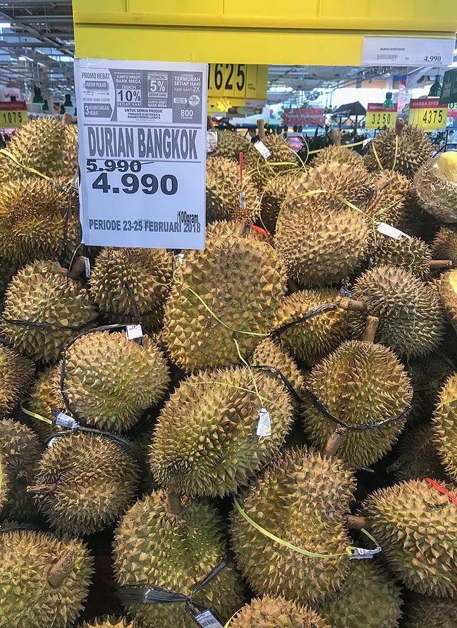 家乐福的榴莲主要是 曼谷 的金枕,当地榴莲是小小个的,砍价厉害的大概5w印尼盾可以买到两个。超市的大榴莲价格比国内便宜不了多少,但是胜在肉质都非常饱满,味道很香。