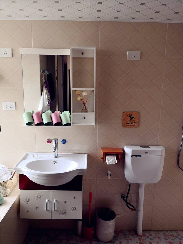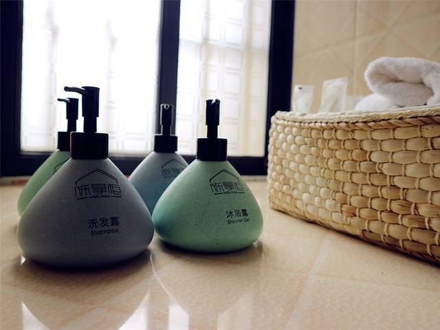 房间宽敞明亮,还有一个很大的阳台,微波炉等厨具一应俱全。洗手间也配备了各种洗浴用品,瓶子上写着陈掌柜几个字,还挺有意思的。不过洗手间不是坐坑而是蹲坑,对于两个年近八十的老人来说是个很大的挑战,也怪我自己没做好攻略。