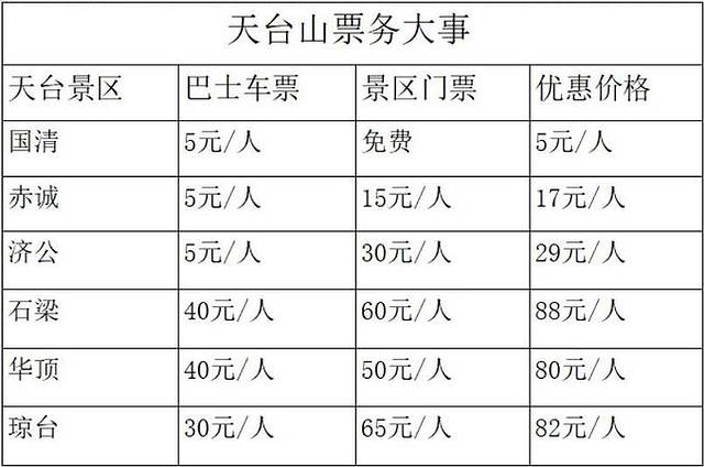 天台山共包含国清景区、济公故居、华顶景区、石梁景区、琼台仙谷和赤城景区共6大景区,各景区的门票可以分开购买,也可以购买联票。