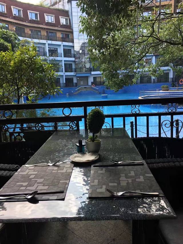 黑森林酒店的自助餐在泳池边上,阳光下斑驳的树影,有花香、有鸟语、还有风吹过,再慢慢品尝厨师的精心制作。