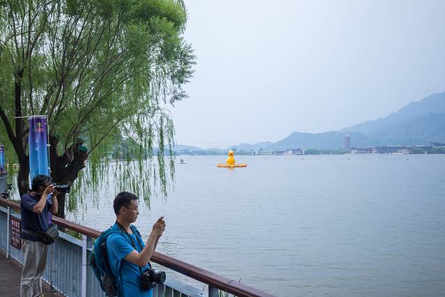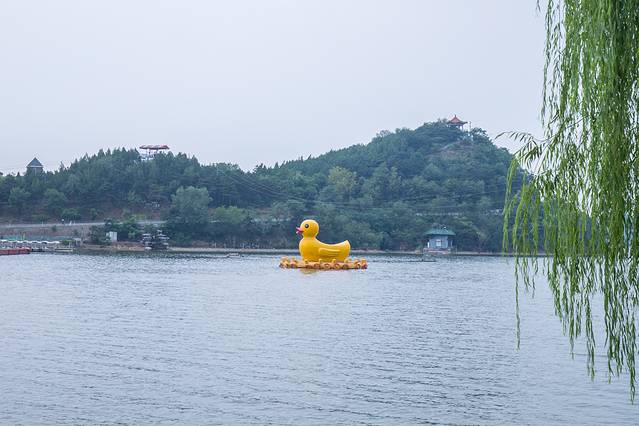 湖中央的大黄鸭在“凝视”。