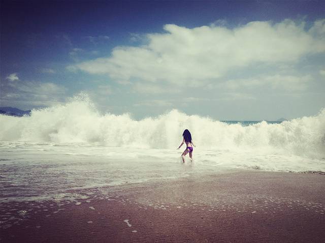 第一次,像个傻子一样,反复冲向海浪,又缩回来。