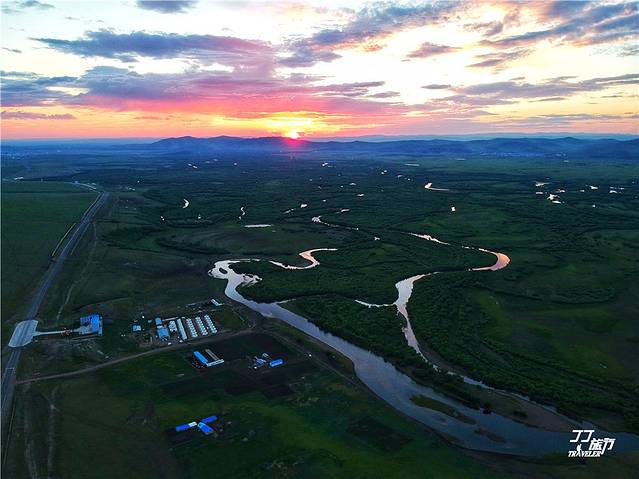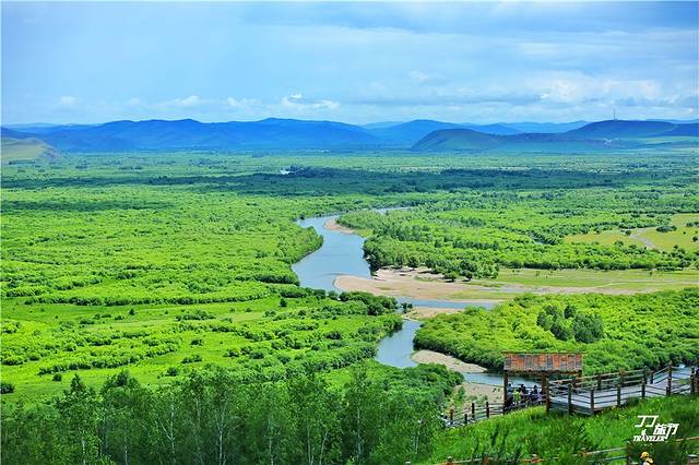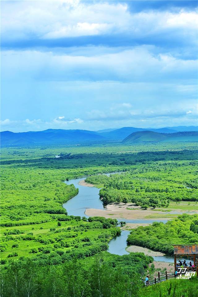 这里可以欣赏湿地的公园,树木参天,野花争艳,空气清新,环境优美。尤其在山坡的观景台上,远眺蜿蜒曲折的河流,就象书写在广袤大地的蒙古文字。