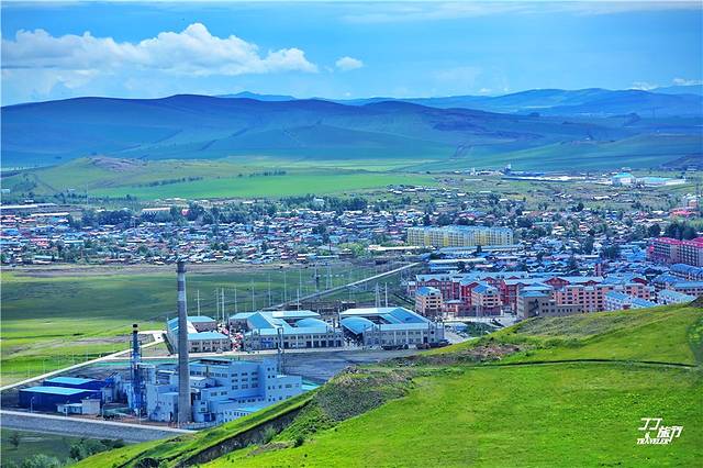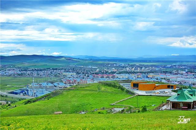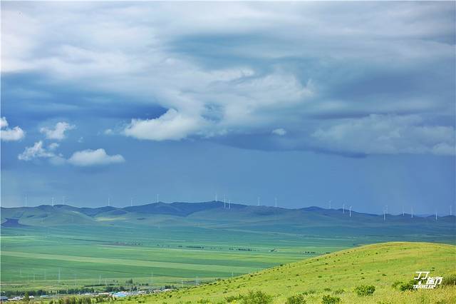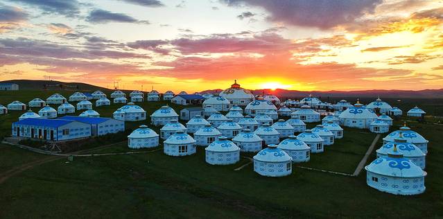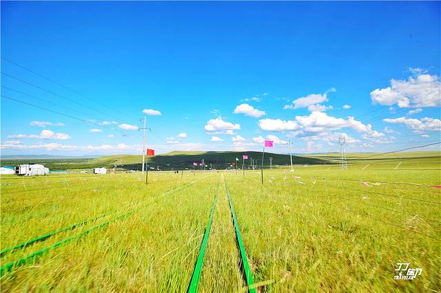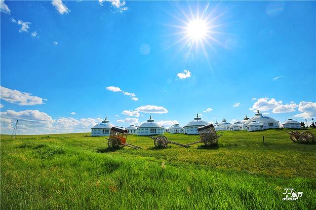 蓝天白云,水草肥美,丘陵起伏,海浪似的牛羊成群。金色霞云的驼群和白云似的羊群在绿海中游动,骑马的牧人,手里拿者细细的套马竿,像矛头一样尖尖地指向天空。传统的蒙古包和现代的蒙古包相映成辉,为这里的大草原组成了一幅美丽动人的图画。