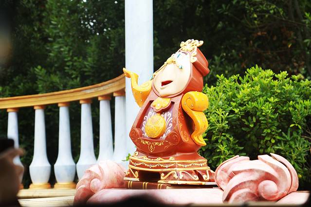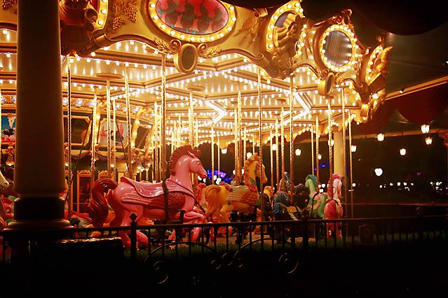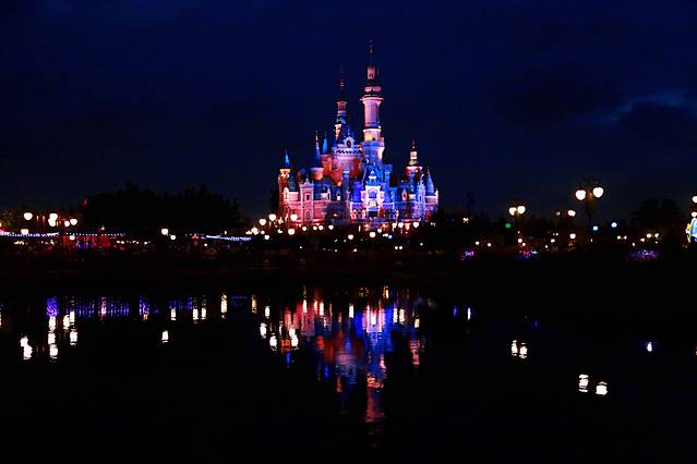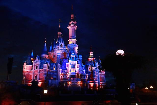 每晚八点半城堡前的夜光幻影秀也是非常值得一看的。第一晚坐在城堡下近距离观看,现场音效配合烟花,一幕幕迪士尼经典形象逐一出现在城堡上,很是震撼。为了占据最佳的观赏位置,很多人六点半已经在城堡前的广场上席地而坐排队了,我们在六点四十五到达那里。在晚上七点过后,人渐渐多起来,现场维持秩序的工作人员也越来越多,据说七点过后城堡前的这块场地就会禁止进入了。第二晚我们在米奇大街正对城堡的湖畔观看夜光幻影秀,音效虽不如第一晚,但能看到全景,看烟花与城堡上的光影交相辉映,加之湖中的倒影,美轮美奂。