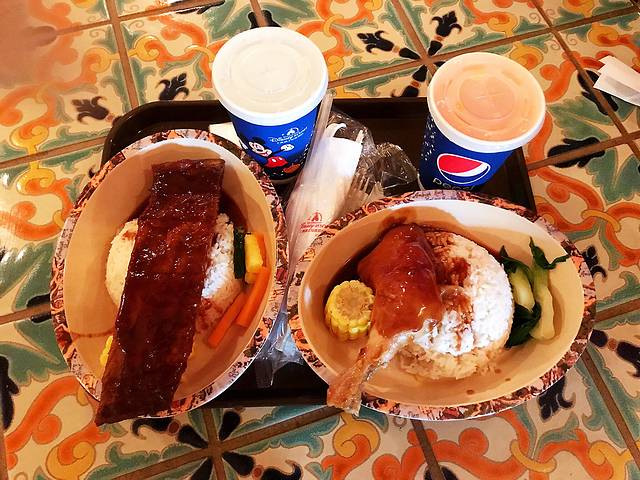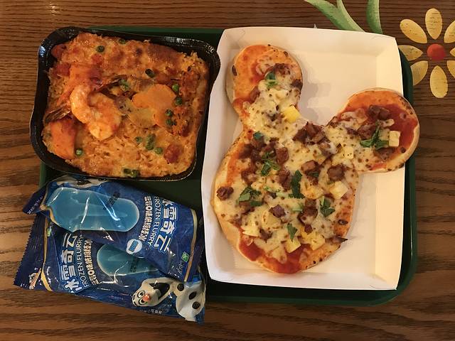 个人觉得梦幻世界的皮诺丘乡村厨房和宝藏湾的巴波萨烧烤值得一去。前者适合带小朋友的游客,做成米奇造成的披萨一定能受到小朋友的欢迎,买套餐送冰雪奇缘主题的蓝莓口味棒冰,虽然口味不敢恭维,但造型还是不错的。特别推荐宝藏湾的巴波萨烧烤,尝试了巴波萨烤猪肋排配饭和船长百里香鸡配饭,口味略甜,但不得不说它的环境,餐厅与“加勒比海盗——沉落宝藏之战”相连,餐厅深处的座位可以看到该游乐项目的游船,非常有创意!