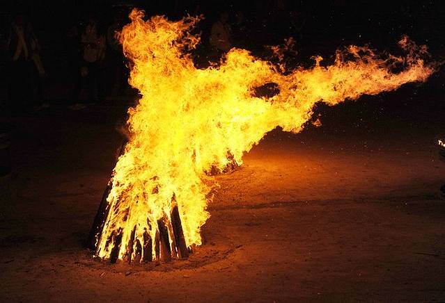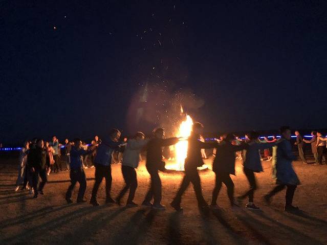 篝火已经燃了起来。大家一手拿着一块肉,兴高采烈的朝火堆奔去。