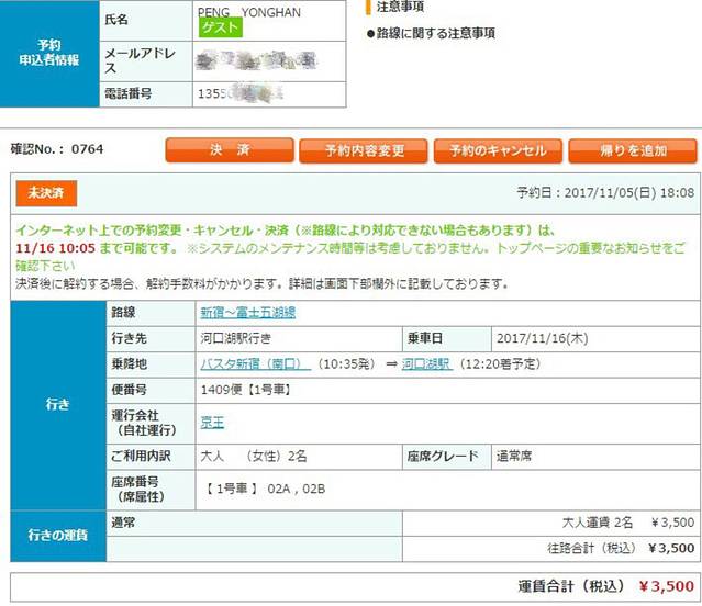 关于巴士票是提前在网站上预定的,像河口湖这样的热门旅行地,当天去车站买票肯定买不到合适的时间,如果提前几天去车站买又很耽误游玩的时间,所以建议提前网上预约,可在网站上预约30天内的BUS票( 网站: https://japanbusonline.com/ ),预定后无需付款,直接凭预定时预留的电话号码到车站的自助机或人工柜台付款取票就行。