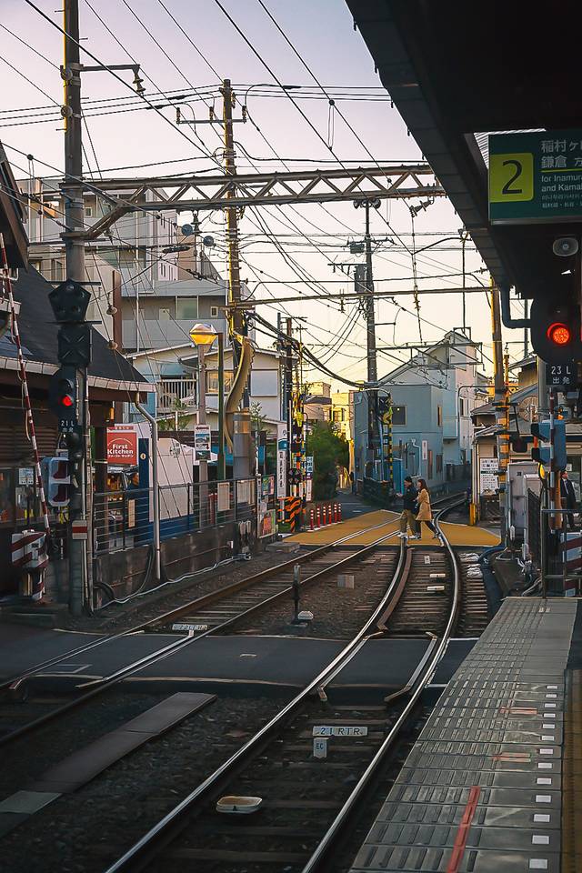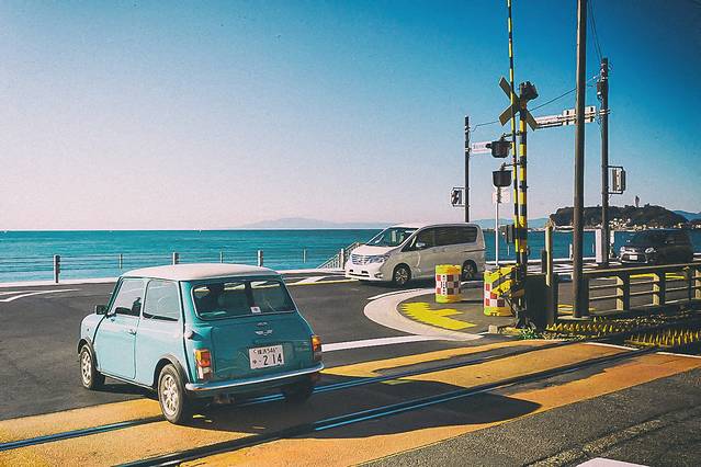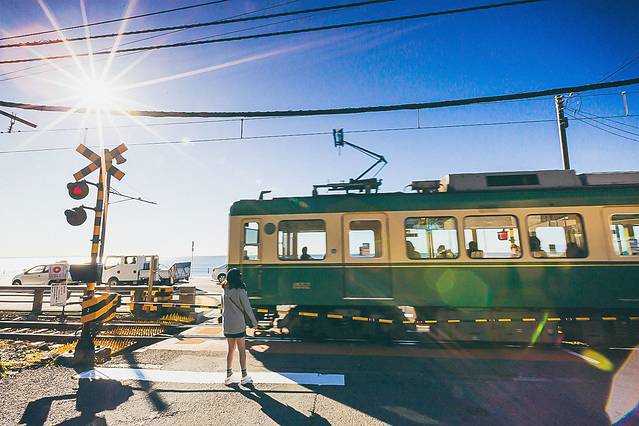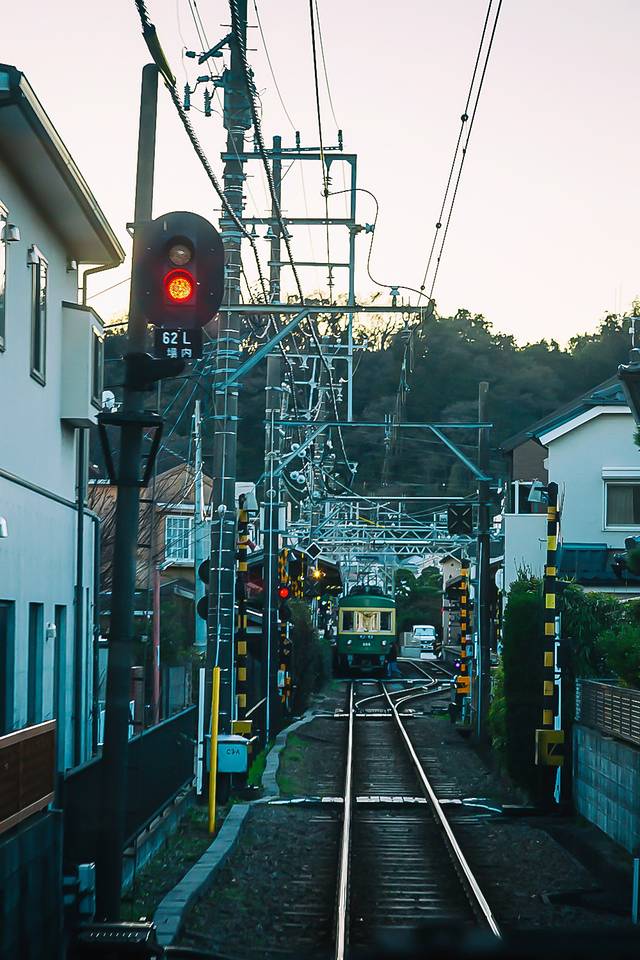 搭上这辆复古的绿皮电车从藤泽出发,窗外的风景自由切换,时而与湛蓝的大海相遇,时而穿梭在狭窄的居民楼宇之间,时而与路面行驶的汽车同行,坐在最后一节车厢还能透过驾驶室的玻璃拍到铁轨的画面。