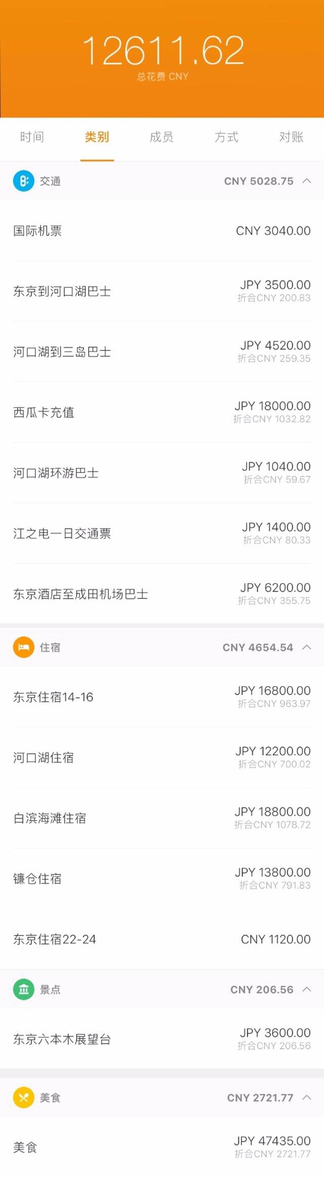 费用为两人合计12611.62,平均6305.81/人。包括:交通、住宿、美食、景点,不包括各自的购物费用。
