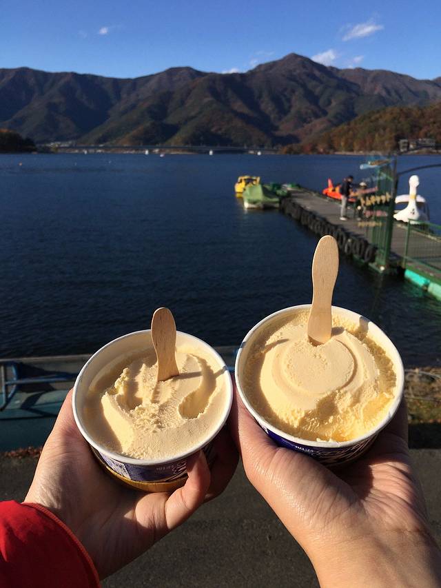 在河口湖边的Family Mart里买了便当和冰激凌,然后去湖边野餐。
