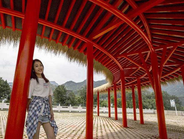 村口平坦处有一处广场,一座凉亭呈半月蜿蜒于中央,顶上覆盖的茅草,为亭子增添了不少沧桑感。