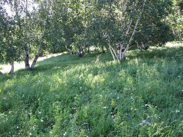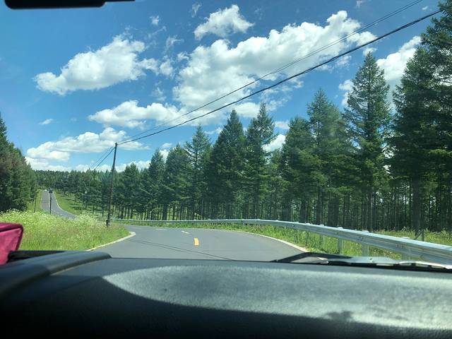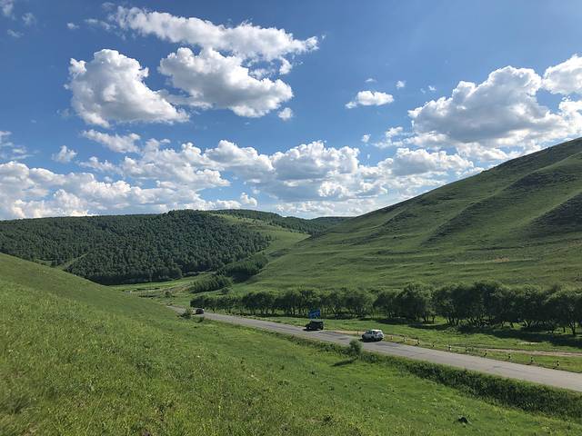 自驾五彩山方向,路边一半草场野花,一半延马路边生长矮白桦林