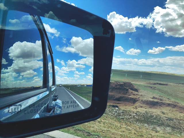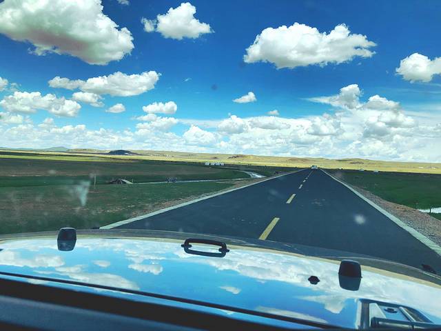 路上风光,蓝天,棉花云,映衬在机箱盖上,美的过分了