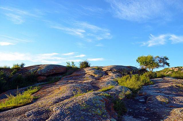 草原上大部分都被低矮的灌木和根系发达的小草紧紧抓握着,裸露的白沙在蓝天绿草间格外醒目
