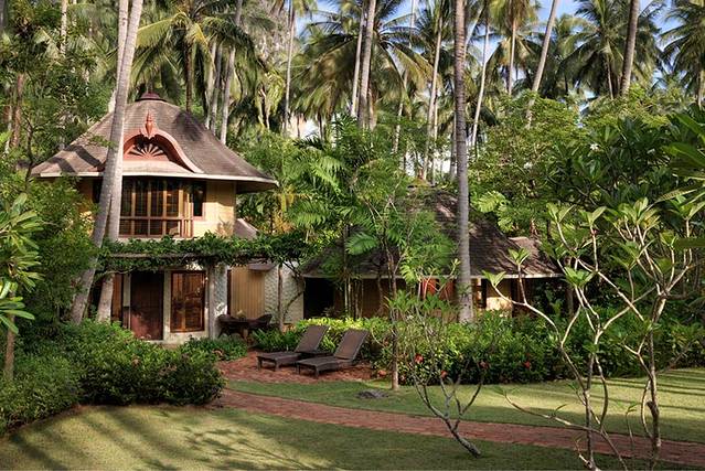 酒店的建筑设计依旧保留了东南亚常见的坡屋顶,圆形的黄土面的建筑风格,这样掩盖在椰林中的小城堡,怕是只能在这里看到了吧。